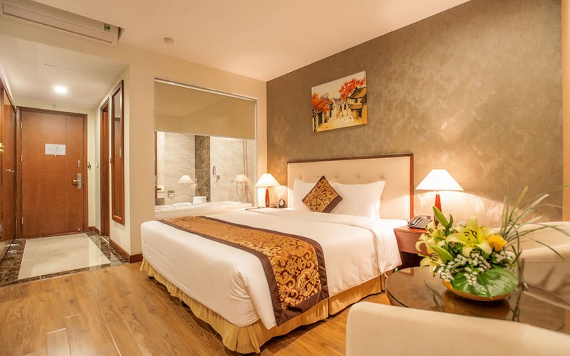 Phòng rộng 60m2, có view hướng phố, Có 1 giường lớn 2m, phòng tiếp khách.