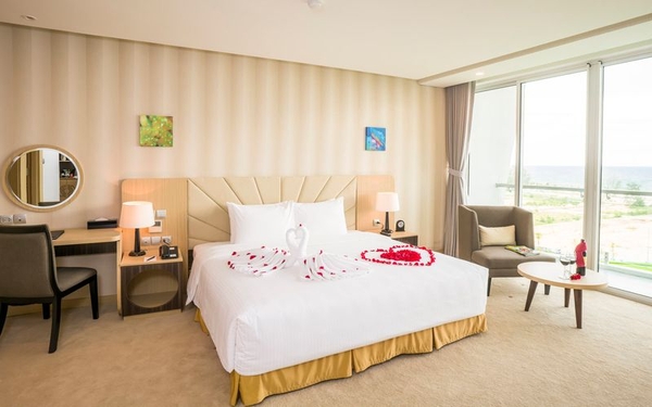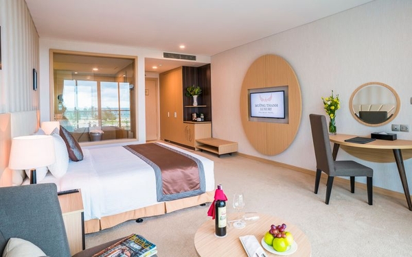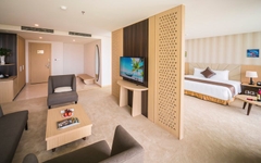 Phòng có diện tích 37m2, gồm 01 giường đôi cỡ lớn 1,8m x 2m, bàn làm việc, phòng tắm đứng. Phòng áp dụng cho 02 người lớn và trẻ dưới 12 tuổi. Tiền phòng bao gồm: Bữa ăn sáng; Hồ bơi, phòng tập Gym.